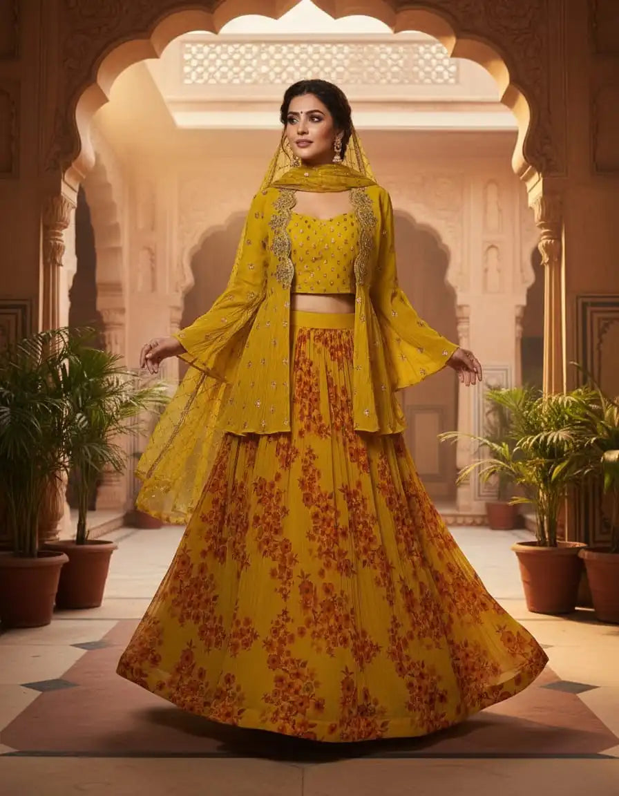 Yellow Chiffon 4-Piece Crop Top Dress | Festive Haldi Wear